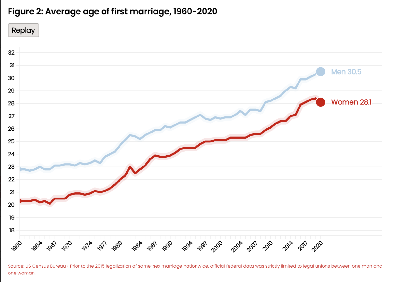 Delays in life milestones that historically prompted insurance purchases present a challenge for the industry. The average age at which a man and a woman marry today has increased approximately eight years since 1960, from 22.8 to 30.5 for men and 20.3 to 28.1 for women.