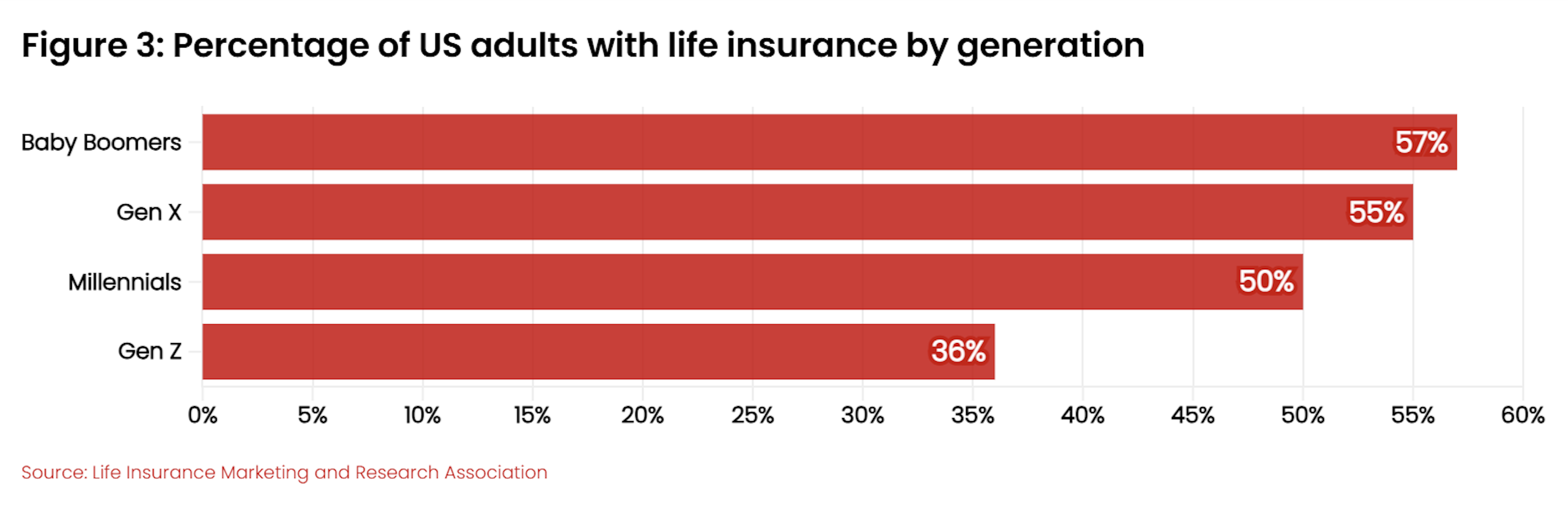 The LIMRA survey also revealed that 63% of consumers under the age of 40 have no immediate marriage plans, and 84% of both single and married under-40 adults have no immediate plans to have a child. This could be a contributing factor behind data showing Gen Z life insurance ownership is more than 20 percentage points lower than it is for Baby Boomers, and 14 percentage points lower than their own next-closest generation, Millennials (Figure 3).