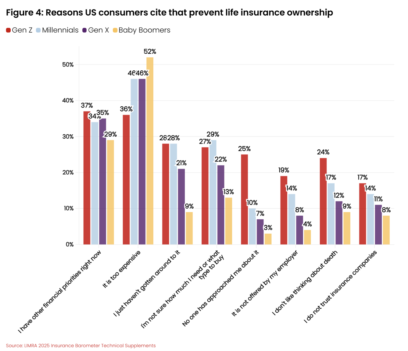 - Lack of access, pointing to the limitations of traditional life insurance distribution models for reaching that demographic, as evidenced by the larger share of Gen Z and Millennials saying that no one has approached them about life insurance, or that it is not offered by their employer, relative to survey respondents from older generations